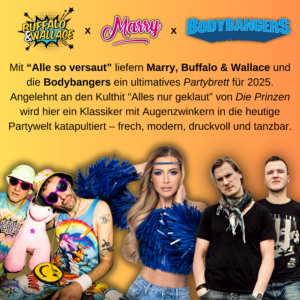 Mit liefern Marry, Buffalo & Wallace und die Bodybangers ein ultimatives Partybrett für 2025. Angelehnt an den Kulthit “Alles nur geklaut” von Die Prinzen wird hier ein Klassiker mit Augenzwinkern in die heutige Partywelt katapultiert – frech, modern, druckvoll und tanzbar.