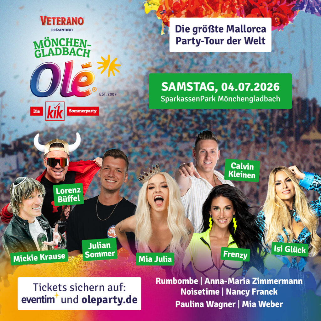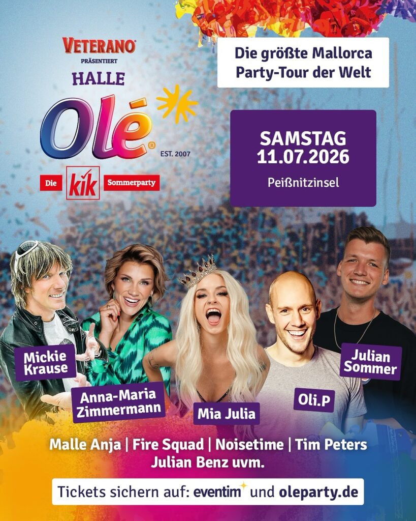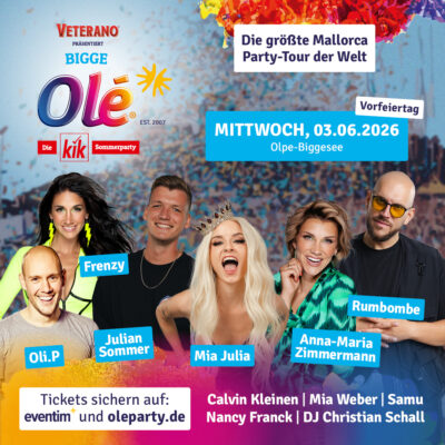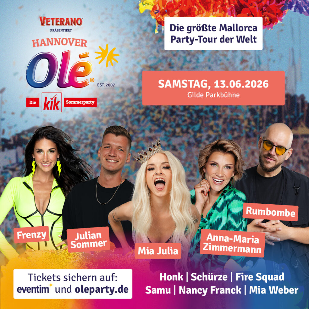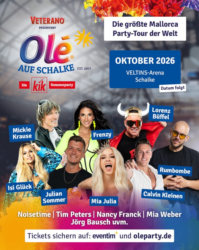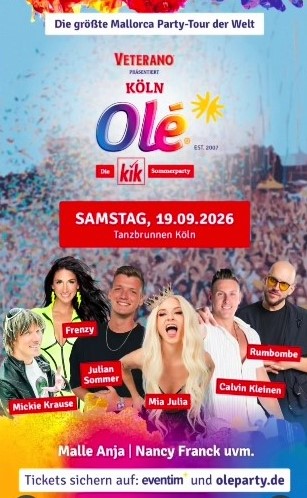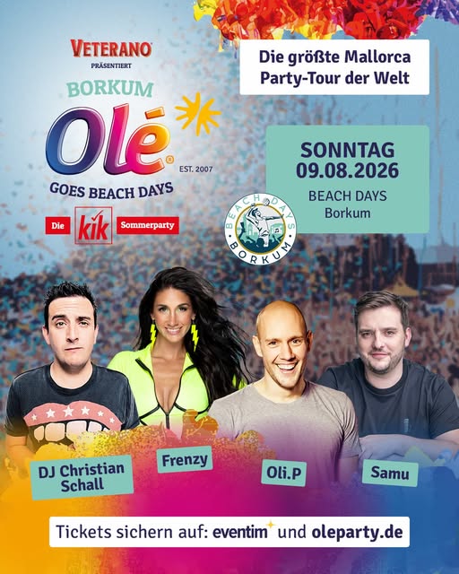 Feier die Party Deines Lebens! Was gibt es Besseres, als tagsüber tanzen und feiern zu gehen? Jedes Jahr sind die Olé Partys mit einem grandiosen Line-Up und fröhlichem Partyflair ein absolutes Highlight für alle Mallorcafans! Ballermann Radio begleitet für Euch auch 2026 die beliebte Olé Partytour!