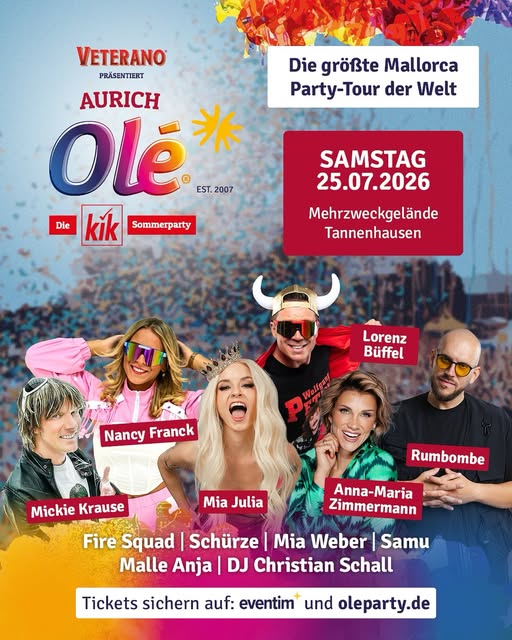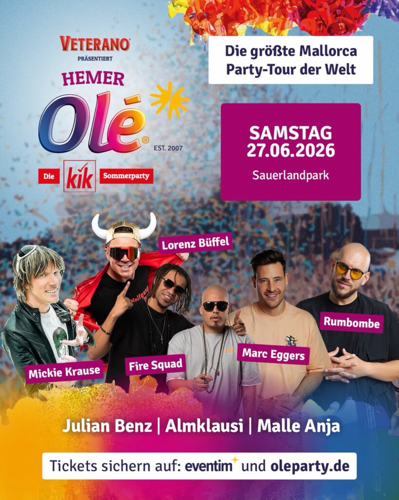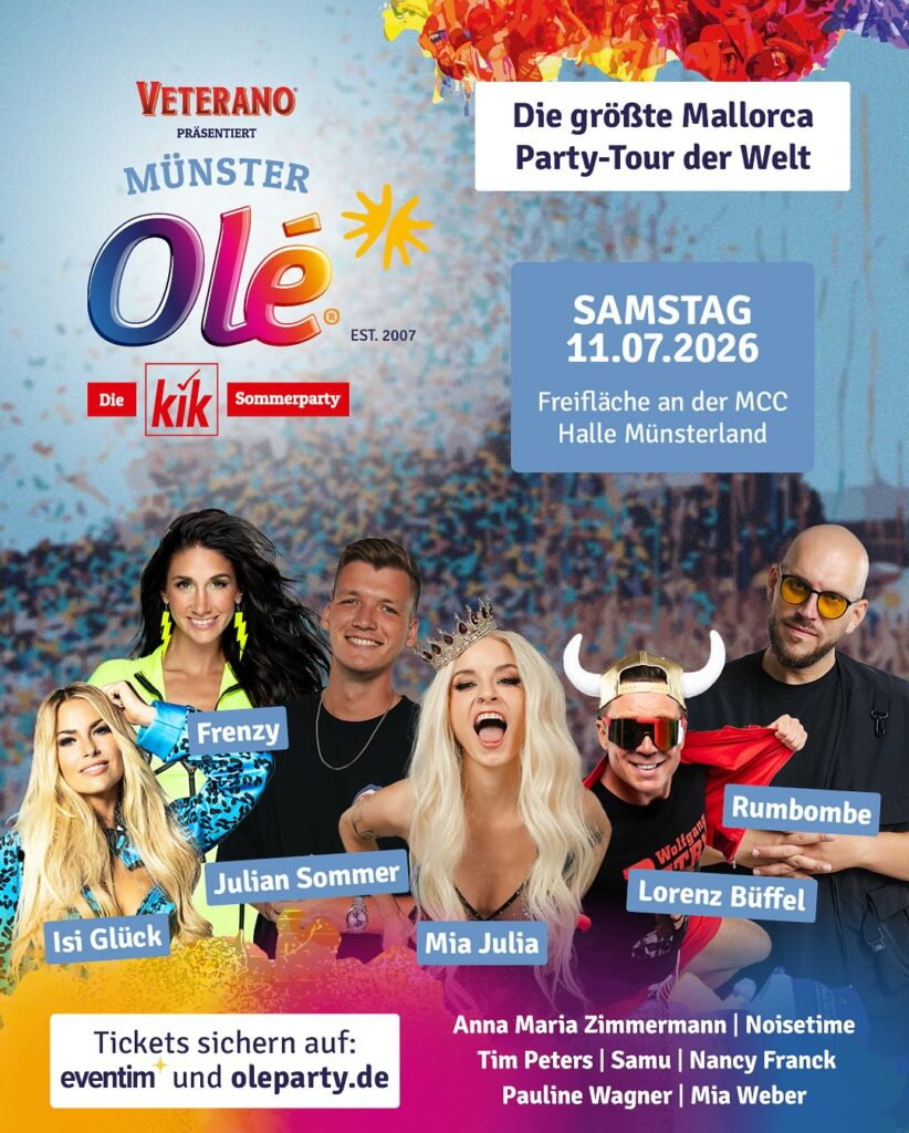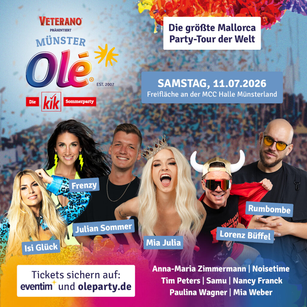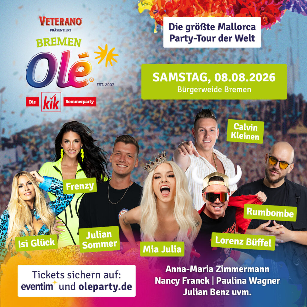 Feier die Party Deines Lebens! Was gibt es Besseres, als tagsüber tanzen und feiern zu gehen? Jedes Jahr sind die Olé Partys mit einem grandiosen Line-Up und fröhlichem Partyflair ein absolutes Highlight für alle Mallorcafans! Ballermann Radio begleitet für Euch auch 2026 die beliebte Olé Partytour!