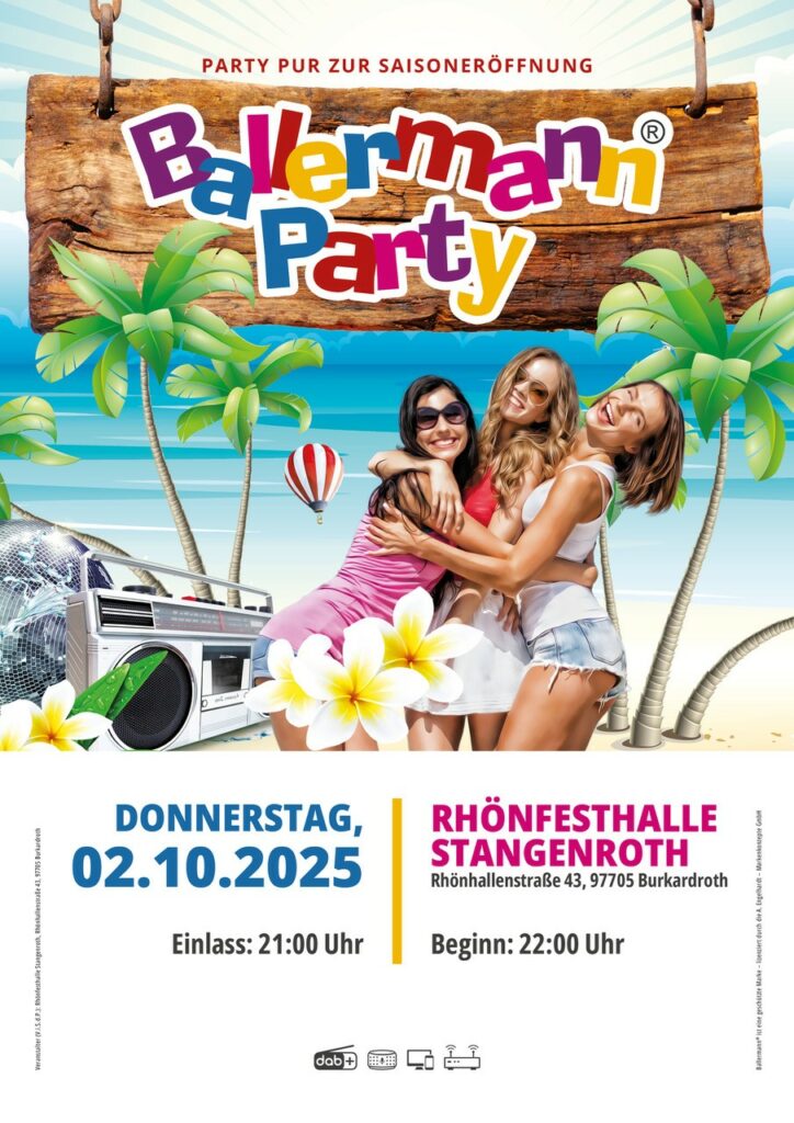 Jedes Jahr ein absolutes Highlight zum Abfeiern! Die Rhönfesthalle lädt Euch zur originalen Ballermann Party am 02. Oktober erneut in die Festhalle in Stangenroth ein. Ballermann Radio verspricht eine außergewöhnliche Nacht voller pulsierender Mallorca-Beats. Erlebt eine 100% Vollgas-Party und richtig geile Stimmung wie auf Malle. Einlass ist um 21.00 Uhr. Tickets gibt es nur an der Abendkasse! Wir freuen uns auf Euch!