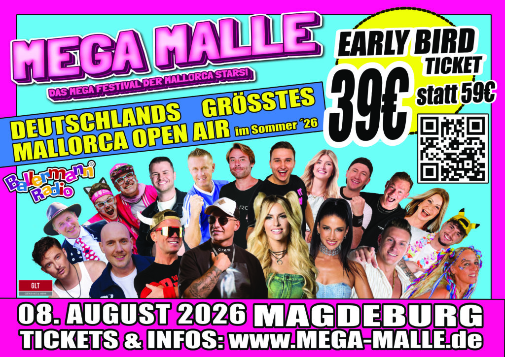 Erlebe die ultimative Mallorca Party in Magdeburg! Am 08. August 2026 verwandelt sich der Elbauenpark wieder in eine riesige Partyzone, die an die berühmte Playa de Palma erinnert. Das Mega Malle Magdeburg Event bringt die größten Stars der Mallorca-Szene direkt zu dir. Feiere mit tausenden anderen Partywütigen zu den besten Hits und genieße eine unvergessliche Nacht voller Stimmung und guter Laune.