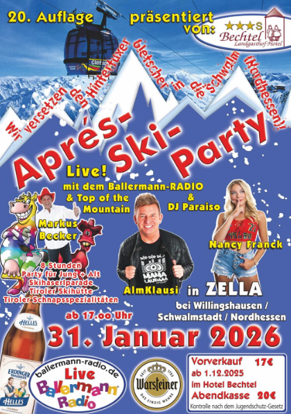 Die legendäre Après-Ski-Party geht in die 20. Runde! Am 31. Januar 2026 verwandelt sich Zella in das heißeste Winter-Partyparadies in Nordhessen! Mit dabei: Almklausi, Markus Becker, Nancy Franck & DJ Paraiso – 8 Stunden Party nonstop!