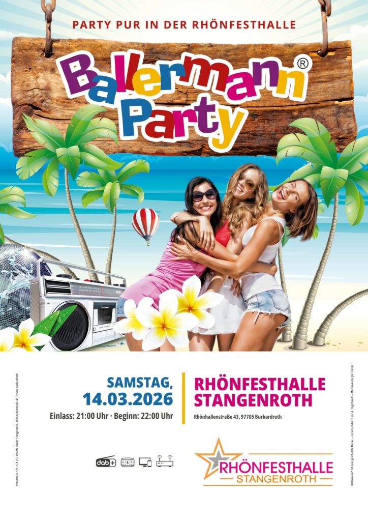 Jedes Jahr ein absolutes Highlight zum Abfeiern! Die Rhönfesthalle lädt Euch zur originalen Ballermann Party am 14. März erneut in die Festhalle in Stangenroth ein. Ballermann Radio verspricht eine außergewöhnliche Nacht voller pulsierender Mallorca-Beats. Erlebt eine 100% Vollgas-Party und richtig geile Stimmung wie auf Malle. Einlass ist um 21.00 Uhr. Tickets gibt es nur an der Abendkasse! Wir freuen uns auf Euch!