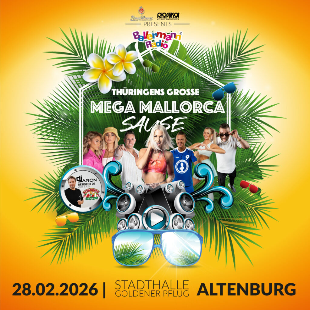 Altenburg läutet jetzt schon die neue Mallorcasaison ein! Denn am 28. Februar 2026 wird die Stadthalle „Goldener Pflug“ zur heißesten Party-Arena Deutschlands! Das Line-up mit Isi Glück, Calvin Kleinen, Stefan Stürmer, Linda Teodosiu & Diane Xandra, Lena Like, Heydecke und DJ Aaron verspricht Euch Inselfeeling mitten im Winter.