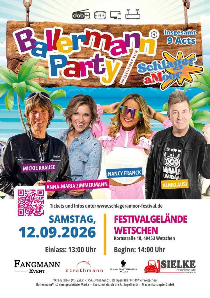 Am 12. September 2026 holen wir das echte Ballermann-Feeling nach Wetschen! Freut Euch auf eine unvergessliche Party voller Schlager, Mitsing-Hits und bester Stimmung. Der Einlass startet um 13 Uhr, ab 14 Uhr heißt es dann: Bühne frei für die Acts!