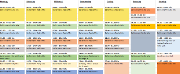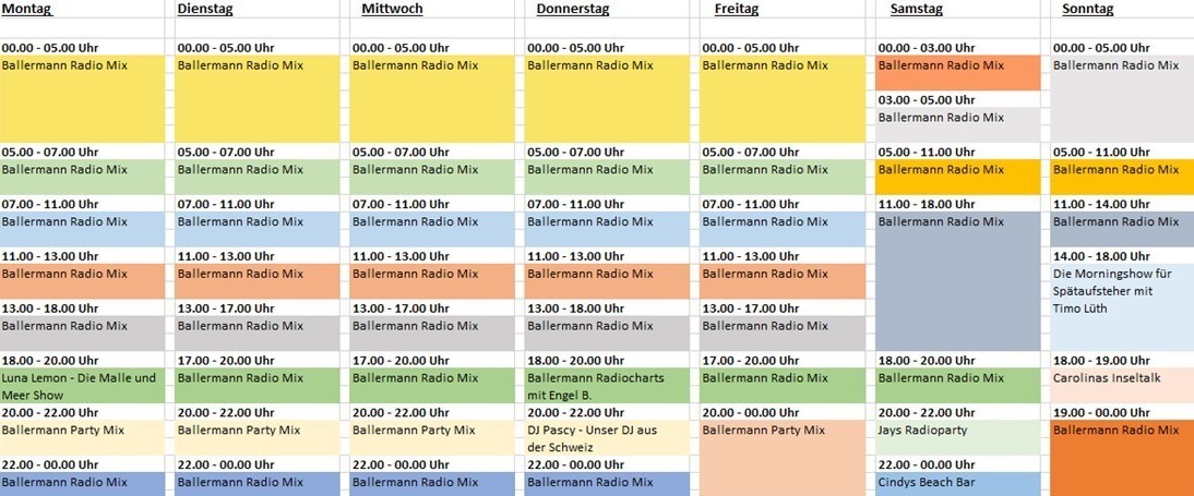 Ballermann Radio sendet sein Musikprogramm rund um die Uhr, 7 Tage die Woche. Ballermann News, Live-Sendungen, brandneue Songs als auch die besten Ballermannhits aller Zeiten, Eventtipps, Ticket-Verlosungen, ansprechende Themensendungen, Aktionen mit Künstlern/innen der Schlager- und Mallorcaszene versprechen ein abwechslungsreiches Programm, um mit Freude durch den Tag zu kommen.